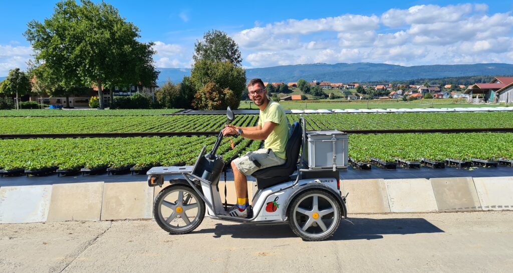 Unser Betriebs-Dreirad ist ebenfalls mit eigenem Solarstrom angetrieben. So sind wir schnell überall in den Kulturen unterwegs.
